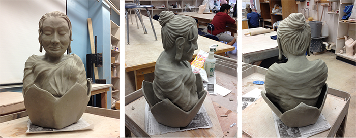 Tasked with sculpting a self-portrait, I imagined myself as a Buddhist monk hatching in a lotus-like egg. This is a reminder to me that enlightenment and rebirth are available to everyone.