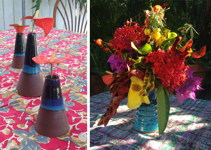 A series of cylinders with which I explored how the use of a single glaze can appear on varying forms. Shown in use as centerpieces on my table.